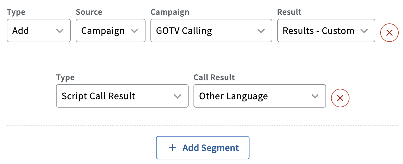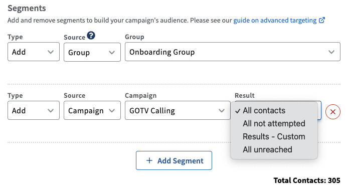 Every targeting setup begins with a Base Segment, which is your starting audience. You can then add or remove additional segments to refine who should receive calls, for a maximum audience size of 150,000 contacts.